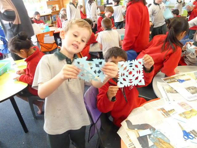 We were enthralled to hear the story of Snowflake Bentley, a man who was the first to photograph snowflakes and publish his images for all to see and enjoy. It is unbelievable that each minute snowflake is totally unique! Our buddy class helped us create snowflake shapes by folding and cutting some paper.